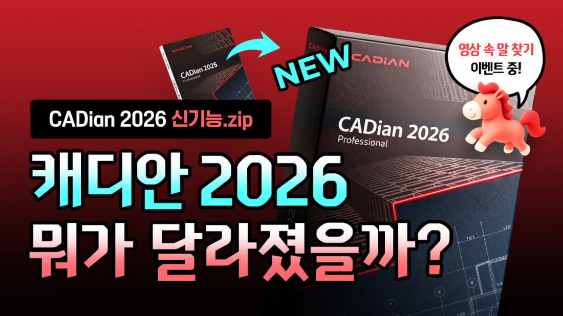 이벤트 영상 링크 : https://www.youtube.com/watch?v=vB8q_qaeuUo 안녕하세요. 캐디안입니다. CADian 2026 출시 및 2026년 병오년 '붉은 말'의 해 기념으로 CADian 2026 신버전에 추가된 여러 새로운 기능을 영상으로 확인하고 함께 참여할 수 있는 유튜브 댓글 이벤트를 준비했습니다.